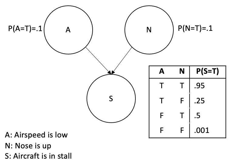What is the probability that the airspeed is low (A=T), the nose is up (N=T) and the aircraft is not in stall (S = F)?
