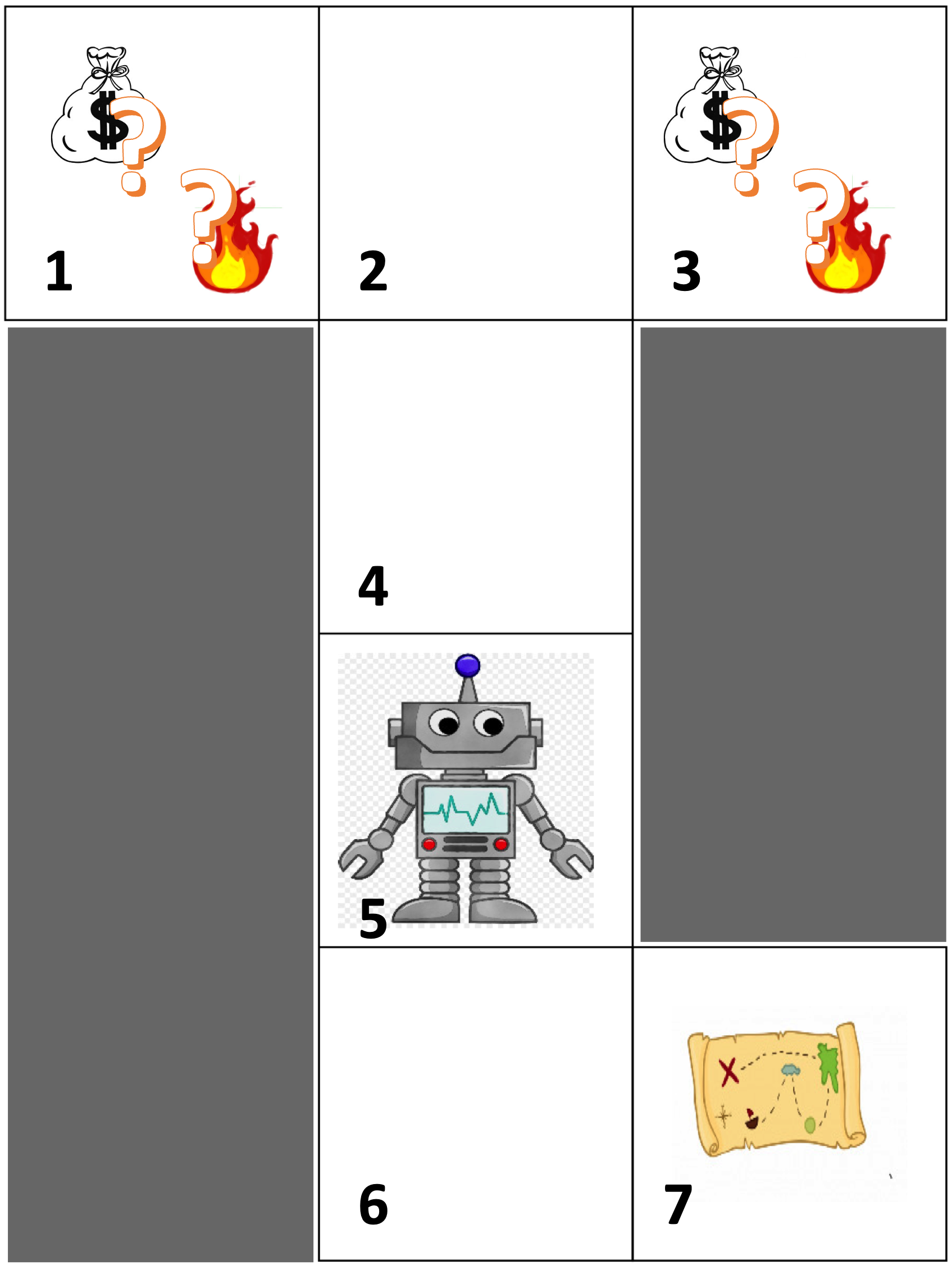 - States: the world states have the form (Robot, Money), where Robot is in loc {1...7} indicating the robot’s location, and Money is in loc {1, 3} indicating the money’s location.