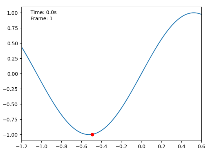 In this problem we'll play with the Mountain Car MDP, a classic problem. You control a car, constrained to move in a line, by telling it to either accelerate left, right, or not accelerate. The car starts initially at some point in a valley, and the goal is to get the car to the top of the mountain on its right as fast as possible. Here is a possible initial state, where the red dot represents the car: